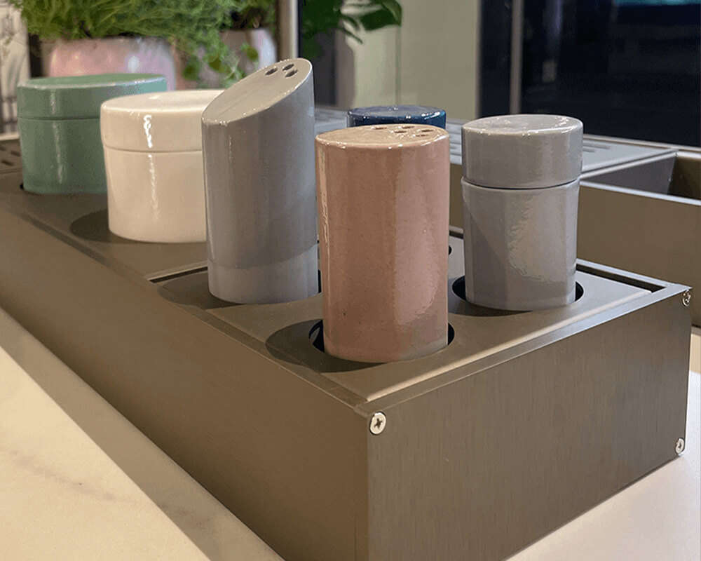 Il canale attrezzato Modus d’appoggio Ossicolor è una struttura in alluminio progettata per essere fissata direttamente al piano cucina.